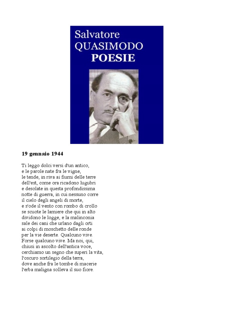 Salvatore Quasimodo Lettera Alla Madre | LioSite Lettera alla madre. Salvatore Quasimodo. .Contemporanea, .Poesia italiana, .Poesie recitate, Madre-mamma. Mater dulcissima, ora scendono le nebbie, il Naviglio urta confusamente sulle dighe, gli alberi si gonfiano d'acqua, bruciano di neve; non sono triste nel Nord: non sono. in pace con me, ma non aspetto. Alessandro Quasimodo on Apple Music Listen to music by Alessandro Quasimodo on Apple Music. Find top songs and albums by Alessandro Quasimodo including Lettera alla madre 1 and Lettera alla madre 2.