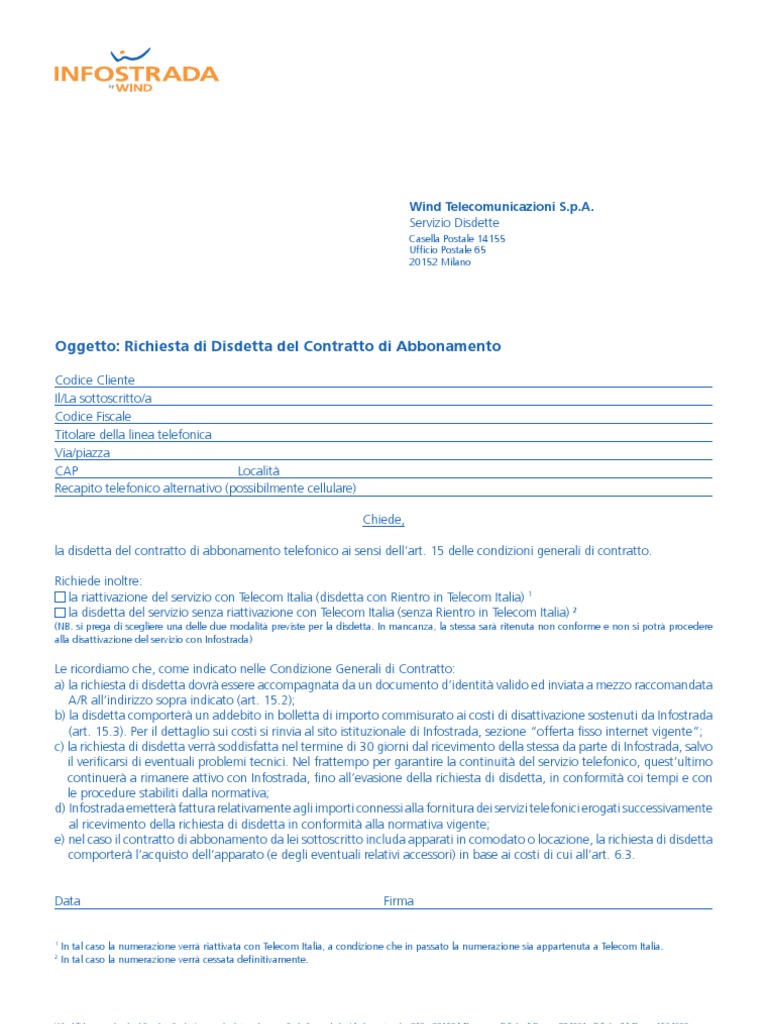Disdetta Infostrada 2023 - Guida e Modulo da scaricare Tutto ciò che dovrete fare sarà compilare il modulo di disdetta di Infostrada inoltrandolo tramite varie modalità: Disdetta tramite raccomandata A/R all'indirizzo: WIND TELECOMUNICAZIONI S.p.A. - Casella Postale 14155, Ufficio Postale Milano 65, Cap 20152 Milano (MI). Disdetta Infostrada tramite PEC (posta elettronica certificata) all ...